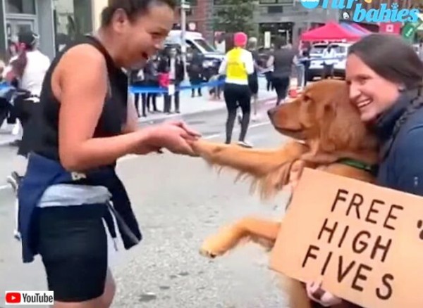 ボクとタッチしようよ Nycマラソンの沿道でフリーハイタッチをしている犬がいた マランダー